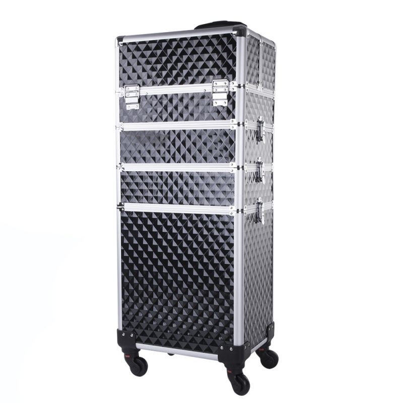 Функционален куфар с колела.Подходящ за маникюристи, козметици, гримьори, работещи на терен или за съхранение на козметика у дома. Оборудвана е с 4 отделения, две от които могат да се демонтират за намаляване на височината и капацитета му.