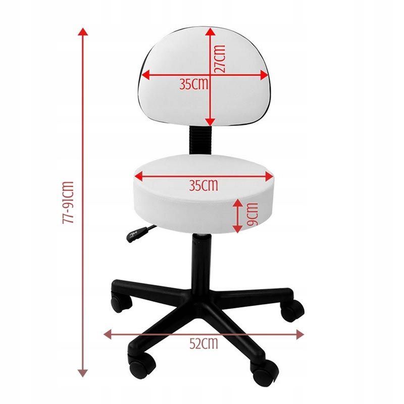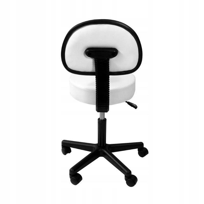 Удобен и елегантен стол с облегалка и хидравлично регулиране на височината. Предлага се в бяло, изработен е от екокожа, която е лесна за почистване, ако се замърси. Предназначен за салони за красота, фризьорски салони, студия за татуировки и медицински заведения. Подходящ е и за домашна употреба, когато искате да поддържате правилна стойка, докато седите.Облегалката позволява отпусната стойка на гърба, перфектно пригодена към лумбалната част на гръбначния стълб, облекчавайки натиска върху гръбначния стълб и увеличавайки комфорта. Освен това, седалките са контурирани, което позволява както конвенционално, така и разкрачено седене. Изработен от висококачествени материали, този козметичен стол гарантира издръжливост и стабилност, което го прави надеждно допълнение към салони, офиси или домове. Компактният и лек дизайн позволява лесна мобилност, позволявайки на потребителите лесно и бързо да местят стола.