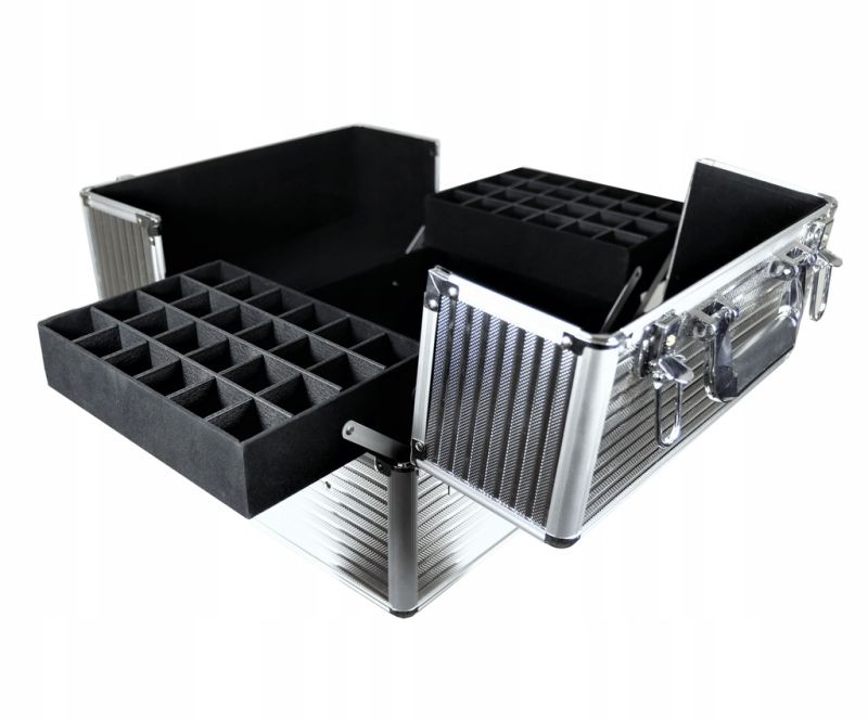 Този козметичен куфар XL разполага с четири модула, идеални за съхранение на грим, четки и други принадлежности. Здравата алуминиева конструкция осигурява устойчивост, а заключващите механизми гарантират сигурност и спокойствие при транспортиране.
